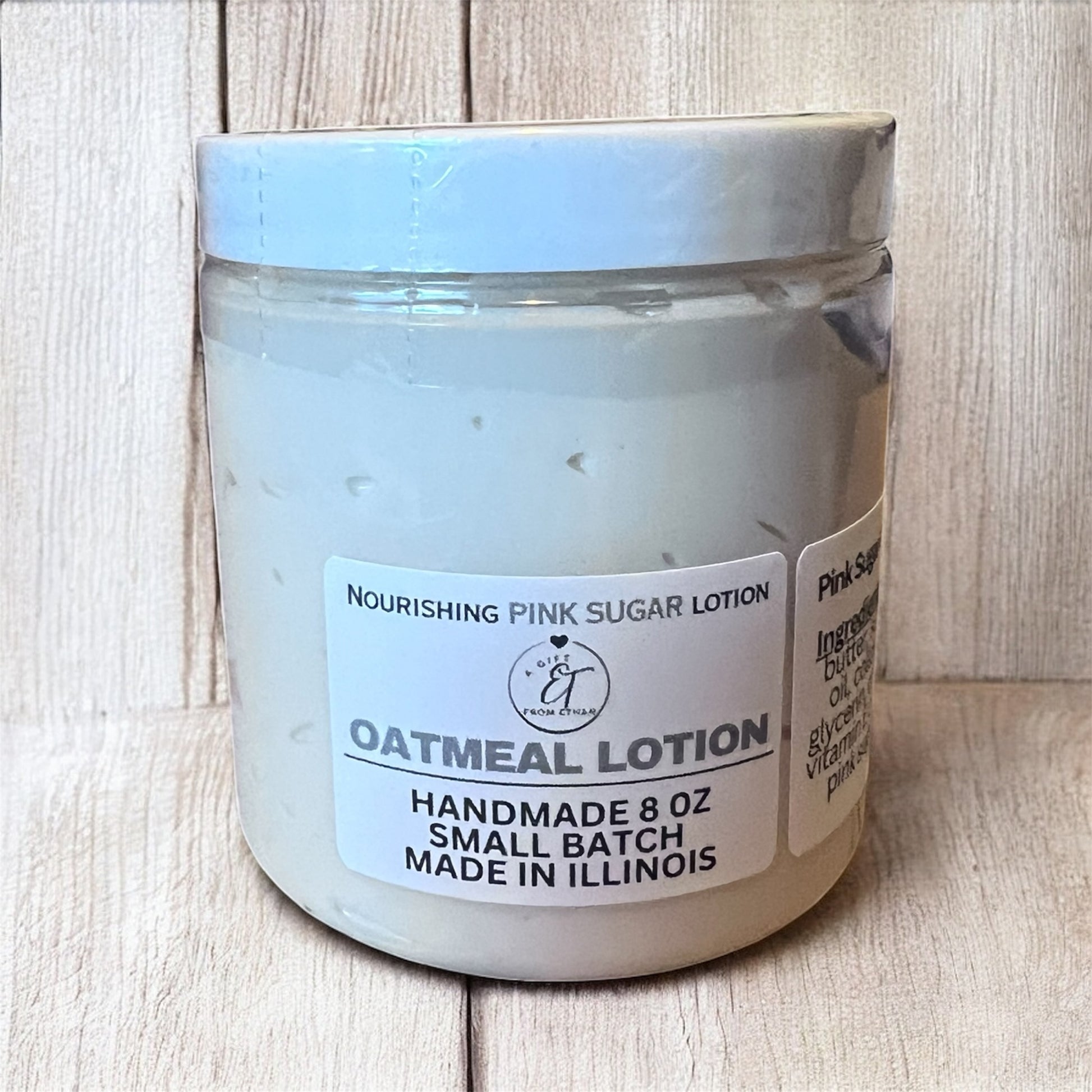 Ingredients: Water, shea butter, sunflower seed oil, colloidal oatmeal, glycerin, emulsifying wax, vitamin E oil, geogard 221 (Fragrance Oil) - Pink Sugar.